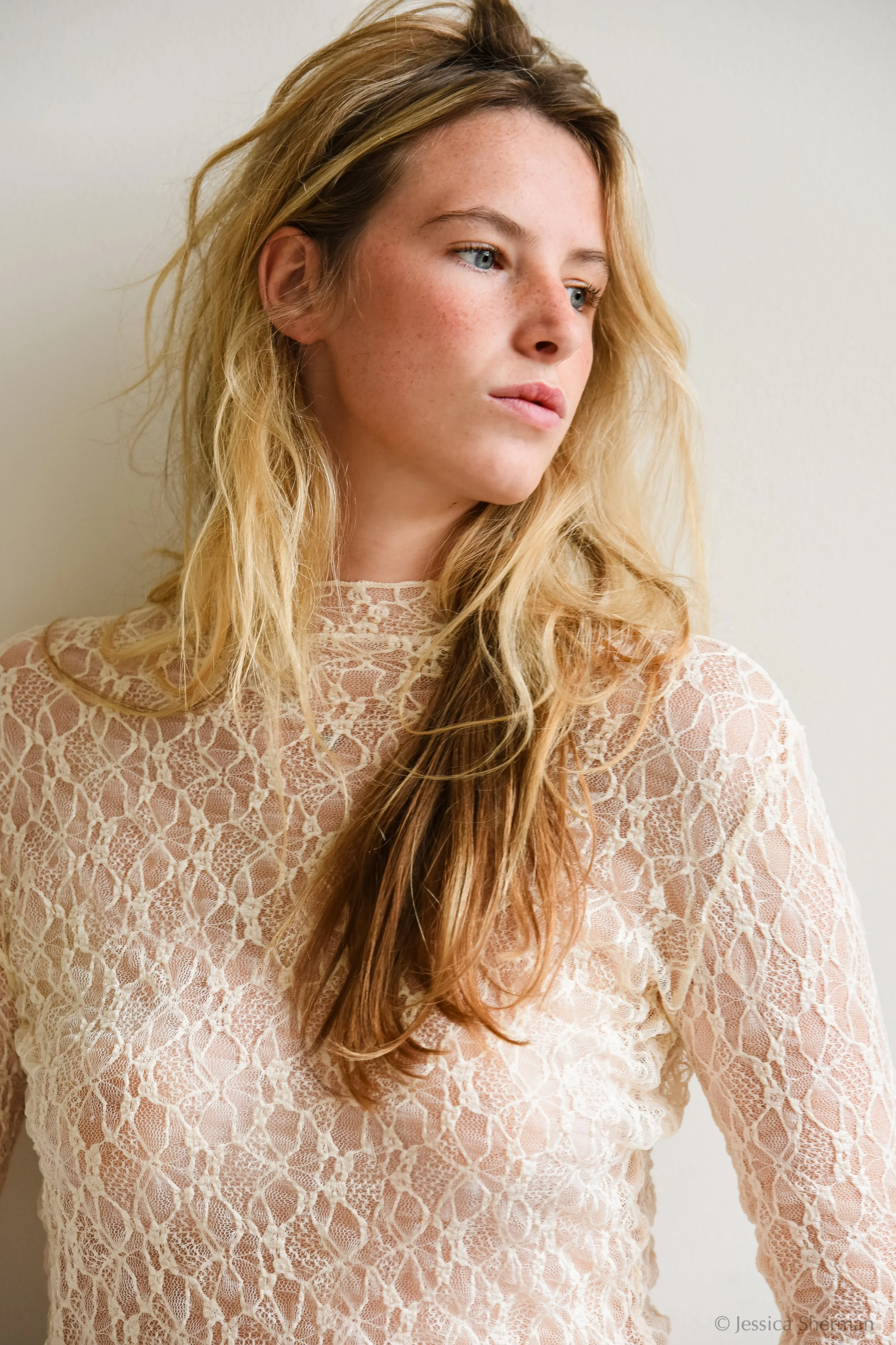 A young woman with long, wavy blonde hair looking to her right, wearing a beige lace long-sleeve top, standing against a plain light-colored wall. View fullsize
