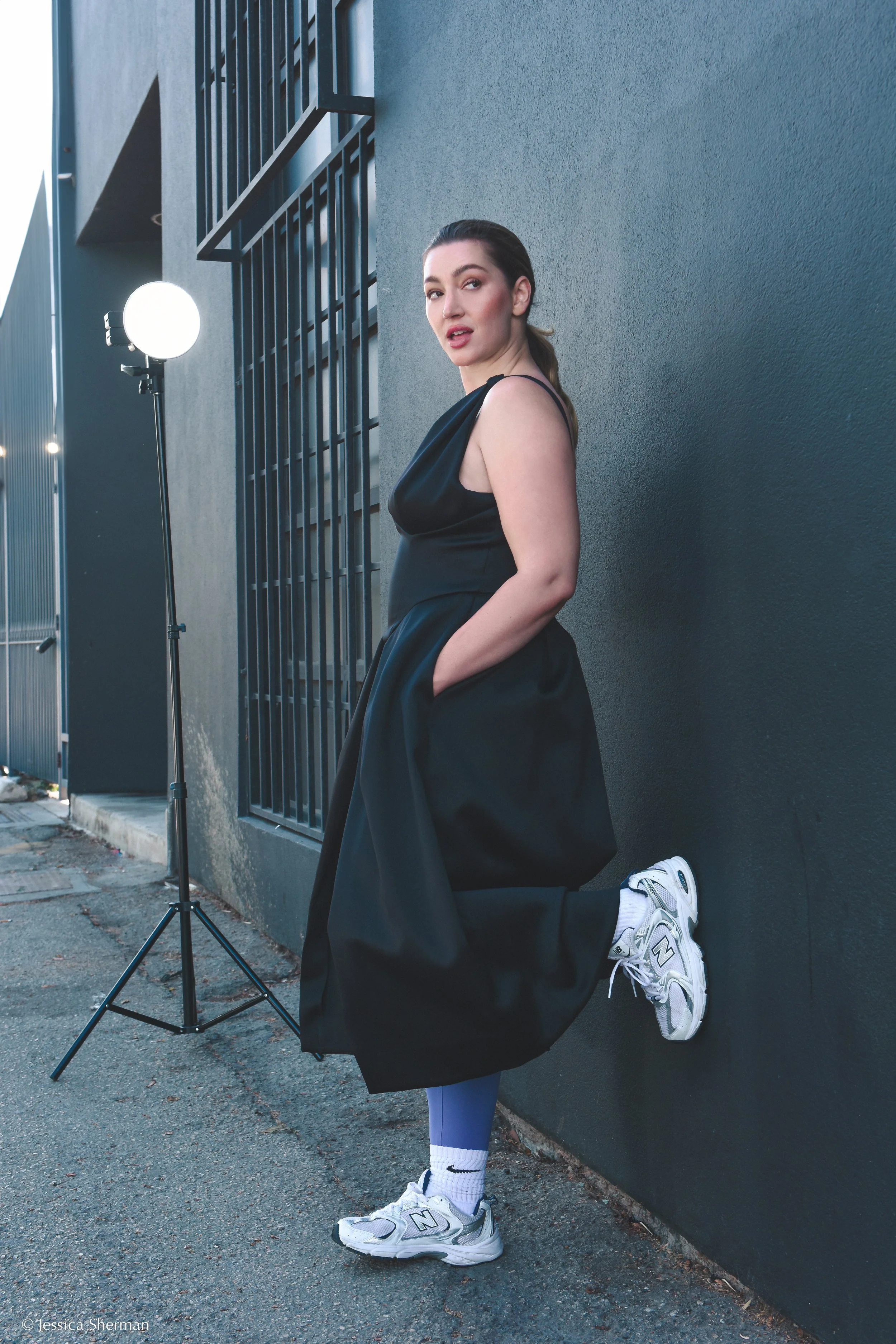 A woman in a black dress and white sneakers posing against a dark gray wall with a portable light on set, during an outdoor photoshoot.